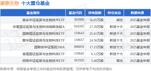 根据2025基金年报公募基金重仓股数据,重仓该股的公募基金共7家,其中持有数量最多的公募基金为嘉实基金的嘉实中证疫苗与生物技术ETF。嘉实中证疫苗与生物技术ETF目前规模为2.28亿元,最新净值0.7193(1月23日),较上一交易日上涨1.77%,近一年上涨13.79%。该公募基金现任基金经理为周泉希。周泉希在任的基金产品包括:嘉实中证芯片产业指数发起式A,管理时间为2025年12月6日至今,期间收益率为21.55%。