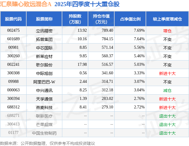汇泉臻心致远混合A的前十大重仓股如下:
