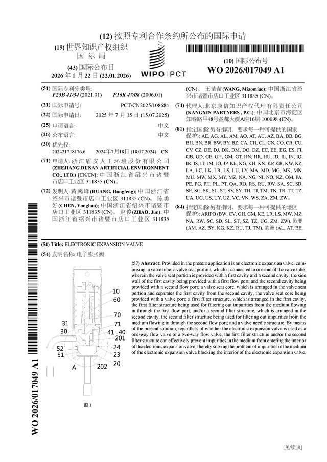 证券之星消息,根据企查查数据显示盾安环境(002011)公布了一项国际专利申请,专利名为“电子膨胀阀”,专利申请号为PCT/CN2025/108684,国际公布日为2026年1月22日。