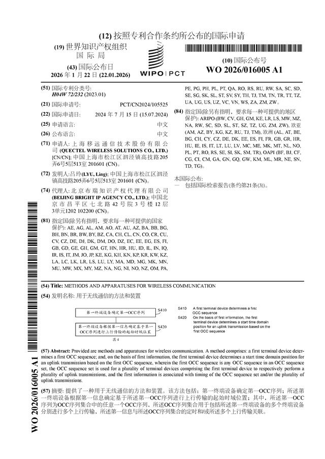 证券之星消息,根据企查查数据显示移远通信(603236)公布了一项国际专利申请,专利名为“用于无线通信的方法和装置”,专利申请号为PCT/CN2024/105525,国际公布日为2026年1月22日。
