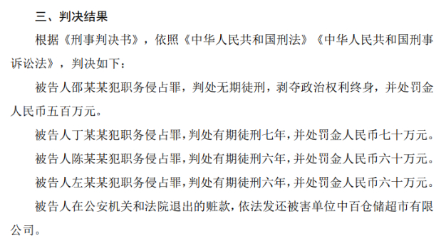两年多后,该案终于迎来一审判决。根据中百集团1月23日发布的公告,判决结果显示,邵某某犯职务侵占罪,判处无期徒刑,剥夺政治权利终身,并处罚金五百万元,其余三名被告人被判处有期徒刑并处罚数万元不等。
