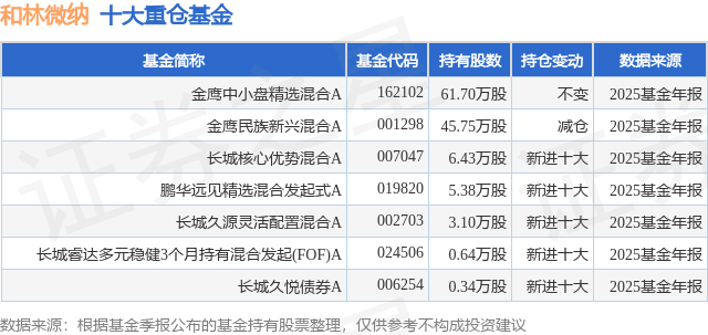 根据2025基金年报公募基金重仓股数据,重仓该股的公募基金共7家,其中持有数量最多的公募基金为金鹰基金的金鹰中小盘精选混合A。金鹰中小盘精选混合A目前规模为6.22亿元,最新净值1.4176(1月28日),较上一交易日下跌0.34%,近一年上涨39.04%。该公募基金现任基金经理为张展华。陈颖在任的基金产品包括:金鹰核心资源混合A,管理时间为2019年1月26日至今,期间收益率为284.86%;金鹰红利价值混合A,管理时间为2020年4月28日至今,期间收益率为199.53%;金鹰科技创新股票A,管理时间为2021年5月18日至今,期间收益率为145.15%;金鹰科技致远混合A,管理时间为2024年3月19日至今,期间收益率为95.86%。张展华在任的基金产品包括:金鹰红利价值混合A,管理时间为2024年11月4日至今,期间收益率为39.43%;金鹰智慧生活混合A,管理时间为2025年1月11日至今,期间收益率为23.15%。