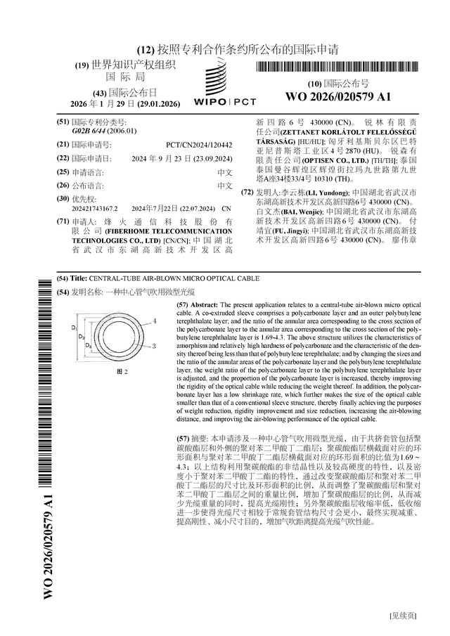 证券之星消息,根据企查查数据显示烽火通信(600498)公布了一项国际专利申请,专利名为“一种中心管气吹用微型光缆”,专利申请号为PCT/CN2024/120442,国际公布日为2026年1月29日。