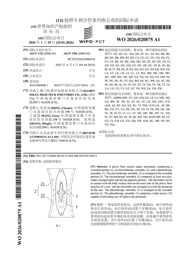 证券之星消息,根据企查查数据显示松霖科技(603992)公布了一项国际专利申请,专利名为“盆底肌修复仪”,专利申请号为PCT/CN2025/086530,国际公布日为2026年1月29日。