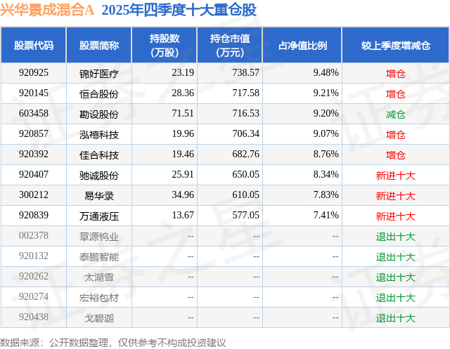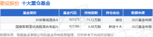 根据2025基金年报公募基金重仓股数据,重仓该股的公募基金共2家,其中持有数量最多的公募基金为兴华基金的兴华景成混合A。兴华景成混合A目前规模为0.69亿元,最新净值1.0936(1月30日),较上一交易日下跌1.02%。该公募基金现任基金经理为崔涛 吕智卓 胡玺潮。吕智卓在任的基金产品包括:兴华安盈一年定开债券发起式,管理时间为2021年8月4日至今,期间收益率为17.65%;兴华安悦纯债A,管理时间为2022年10月19日至今,期间收益率为9.57%;兴华安聚纯债A,管理时间为2023年4月26日至今,期间收益率为15.09%;兴华安惠纯债A,管理时间为2023年6月20日至今,期间收益率为8.89%。崔涛在任的基金产品包括:兴华景和混合发起A,管理时间为2025年6月12日至今,期间收益率为37.68%;胡玺潮在任的基金产品包括:兴华景明混合A,管理时间为2025年9月22日至今,期间收益率为8.53%;兴华兴利债券A,管理时间为2025年10月9日至今,期间收益率为1.21%;兴华景睿混合发起A,管理时间为2026年1月13日至今,期间收益率为nan%。