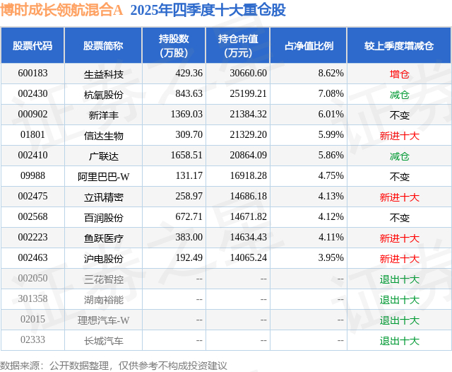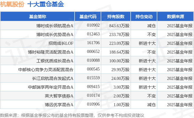 根据2025基金年报公募基金重仓股数据,重仓该股的公募基金共10家,其中持有数量最多的公募基金为博时基金的博时成长领航混合A。博时成长领航混合A目前规模为31.14亿元,最新净值0.8093(2月2日),较上一交易日下跌2.58%,近一年上涨19.88%。该公募基金现任基金经理为陈鹏扬 郭康斌。陈鹏扬在任的基金产品包括:博时裕隆灵活配置混合A,管理时间为2015年8月24日至今,期间收益率为217.78%;博时成长优势混合A,管理时间为2021年8月3日至今,期间收益率为1.86%;博时成长臻选混合A,管理时间为2022年1月25日至今,期间收益率为34.87%。郭康斌在任的基金产品包括:博时价值臻选持有期混合A,管理时间为2022年2月23日至今,期间收益率为-2.79%;