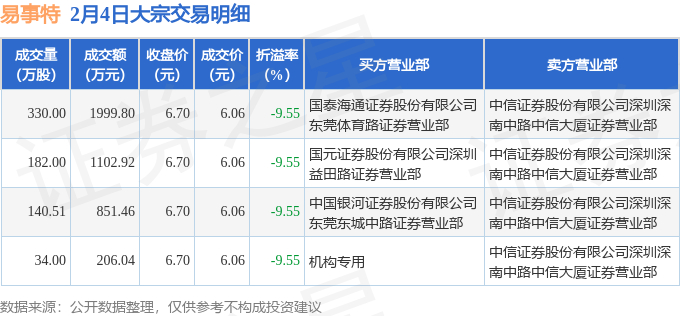 证券之星消息,2月4日易事特发生大宗交易,交易数据如下: