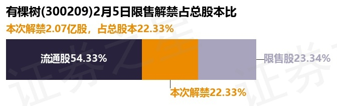 证券之星消息,根据市场公开信息整理,有棵树(300209)于2月5日将有2.07亿股限售股份解禁,为公司其他类型,占公司总股本22.33%。(本次数据根据历史公告整理得出,实际情况以上市公司最新公告为准)本次解禁后,公司还有2.17亿股限售股份,占总股本23.34%。具体如下图所示:
