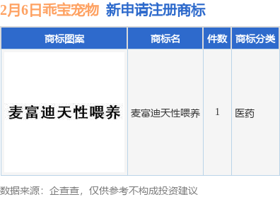 证券之星消息,根据天眼查APP数据显示,近日乖宝宠物食品集团股份有限公司新提交“麦富迪天性喂养”商标注册申请。商标申请详情如下: