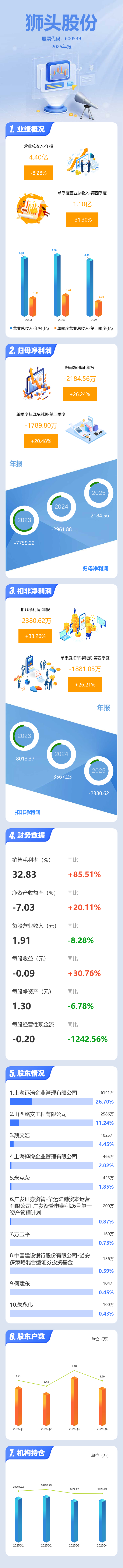 证券之星消息,狮头股份2025年年报显示,当年度公司主营收入4.4亿元,同比下降8.28%;归母净利润-2184.56万元,同比上升26.24%;扣非净利润-2380.62万元,同比上升33.26%;其中2025年第四季度,公司单季度主营收入1.1亿元,同比下降31.31%;单季度归母净利润-1789.8万元,同比上升20.49%;单季度扣非净利润-1881.03万元,同比上升26.22%;负债率24.51%,投资收益196.15万元,财务费用202.74万元,毛利率32.83%。