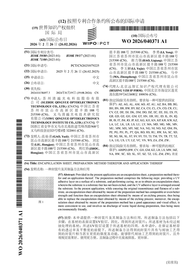 证券之星消息,根据企查查数据显示清越科技(688496)公布了一项国际专利申请,专利名为“一种封装片及其制备方法和应用”,专利申请号为PCT/CN2025/079225,国际公布日为2026年2月26日。