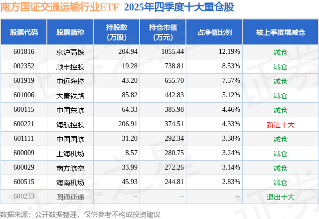 南方国证交通运输行业ETF的前十大重仓股如下: