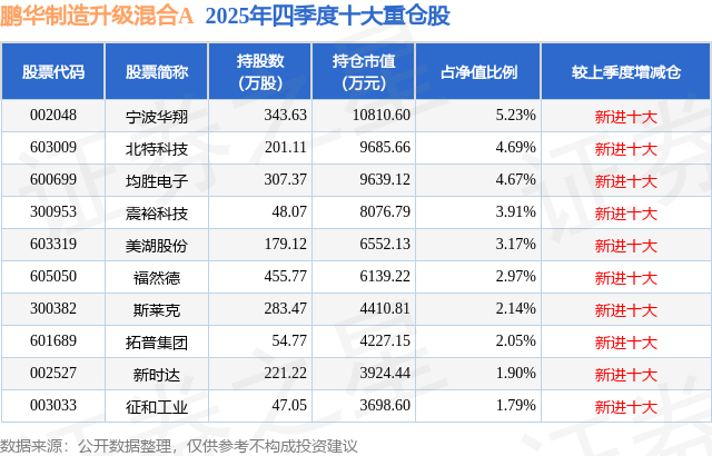 鹏华制造升级混合A的前十大重仓股如下: