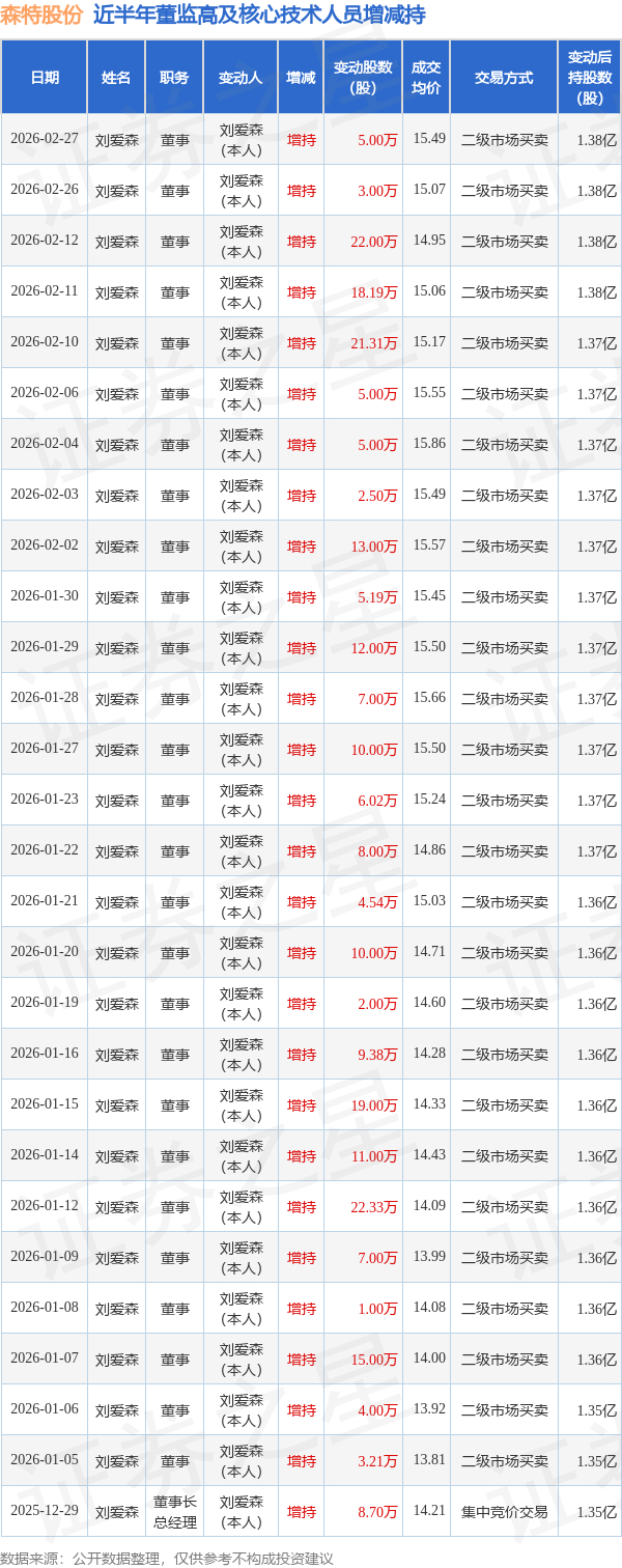 森特股份近半年内的董监高及核心技术人员增减持详情如下: