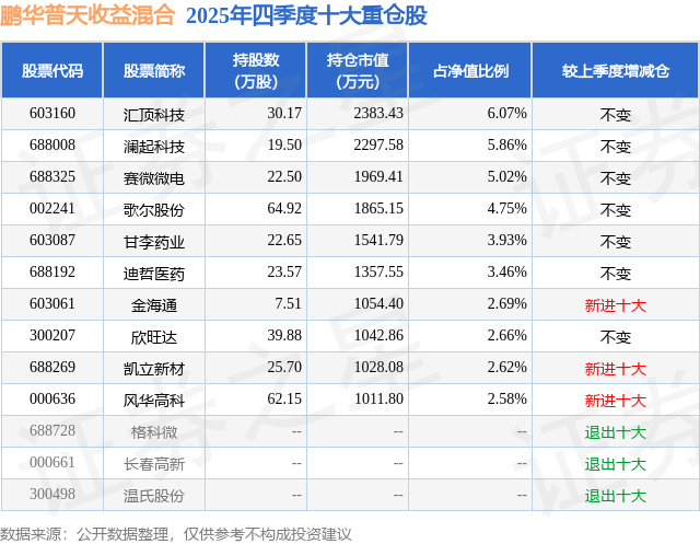 根据2025基金年报公募基金重仓股数据,重仓该股的公募基金共1家,其中持有数量最多的公募基金为鹏华基金的鹏华普天收益混合。鹏华普天收益混合目前规模为3.92亿元,最新净值2.682(3月2日),较上一交易日下跌1.72%,近一年上涨25.38%。该公募基金现任基金经理为蒋鑫。蒋鑫在任的基金产品包括:鹏华健康环保混合,管理时间为2016年6月24日至今,期间收益率为126.04%;鹏华优选成长混合A,管理时间为2020年12月16日至今,期间收益率为-12.91%;鹏华远见成长混合A,管理时间为2021年6月2日至今,期间收益率为-7.75%。