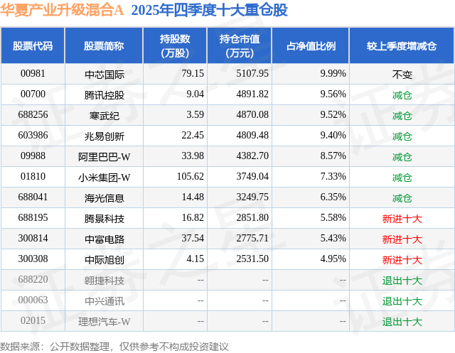 根据2025基金年报公募基金重仓股数据,重仓该股的公募基金共1家,其中持有数量最多的公募基金为华夏基金的华夏产业升级混合A。华夏产业升级混合A目前规模为3.11亿元,最新净值2.2186(3月3日),较上一交易日下跌3.94%,近一年上涨26.32%。该公募基金现任基金经理为屠环宇。屠环宇在任的基金产品包括:华夏创新前沿股票A,管理时间为2020年3月23日至今,期间收益率为140.59%;华夏创业板两年定开混合,管理时间为2021年2月22日至今,期间收益率为13.63%;华夏时代前沿一年持有混合A,管理时间为2021年8月24日至今,期间收益率为10.6%;华夏科技前沿6个月定开混合A,管理时间为2022年8月22日至今,期间收益率为44.72%。