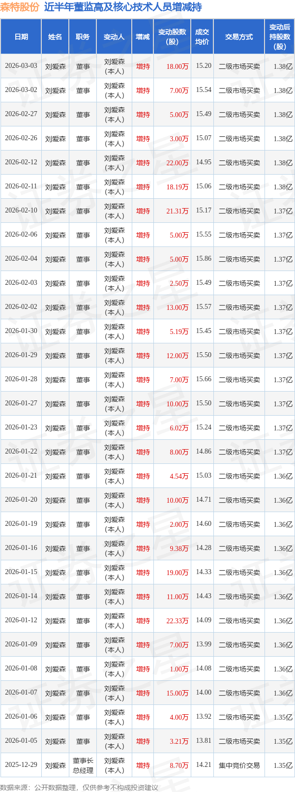 森特股份近半年内的董监高及核心技术人员增减持详情如下: