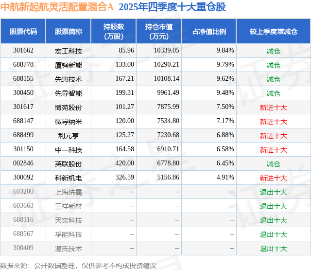 中航新起航灵活配置混合A的前十大重仓股如下: