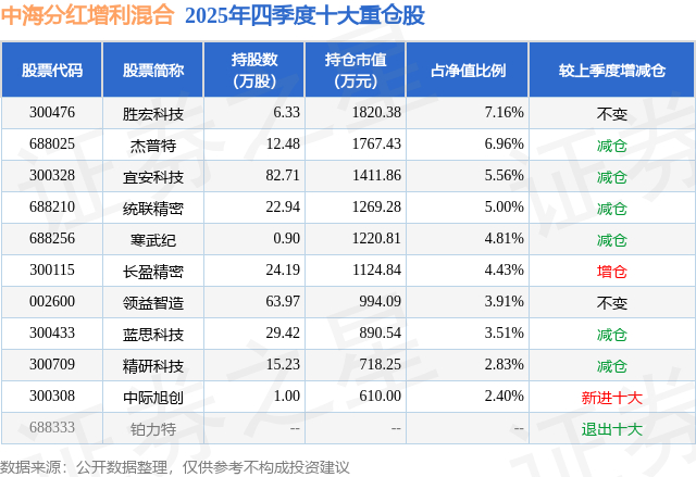 根据2025基金年报公募基金重仓股数据,重仓该股的公募基金共2家,其中持有数量最多的公募基金为中海基金的中海分红增利混合。中海分红增利混合目前规模为2.54亿元,最新净值0.7924(3月9日),较上一交易日下跌2.41%,近一年上涨13.1%。该公募基金现任基金经理为邱红丽。邱红丽在任的基金产品包括:中海积极收益混合,管理时间为2021年7月30日至今,期间收益率为0.0%;中海顺鑫灵活配置混合,管理时间为2021年7月30日至今,期间收益率为-44.96%。