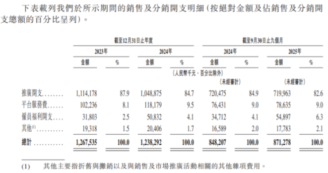 导致净利润率个位数的核心原因,在于公司沉重的营销负担。招股书显示,2023年、2024年以及2025年前三季度(以下简称“报告期内”),公司的销售及分销开支分别高达12.68亿元、12.38亿元和8.71亿元,占同期收入的比重分别达到65.1%、59.4%和57.6%。