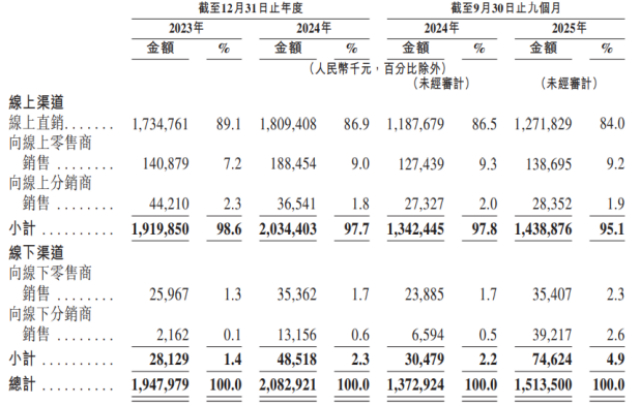 证券之星留意到,HBN的销售命脉与各大互联网平台深度绑定。公司目前主要通过以天猫、京东为代表的传统电商平台以及以抖音为代表的新兴内容电商平台在线销售产品。报告期内,公司来自线上渠道的收入占比均超过95%,其中各期线上直销渠道贡献的收入分别为17.35亿元、18.09亿元以及12.72亿元,占各期总营收的比重分别达到89.07%、86.8%和84.02%。相较之下,各期来自线下渠道的收入占比仅分别为1.4%、2.3%和4.9%。