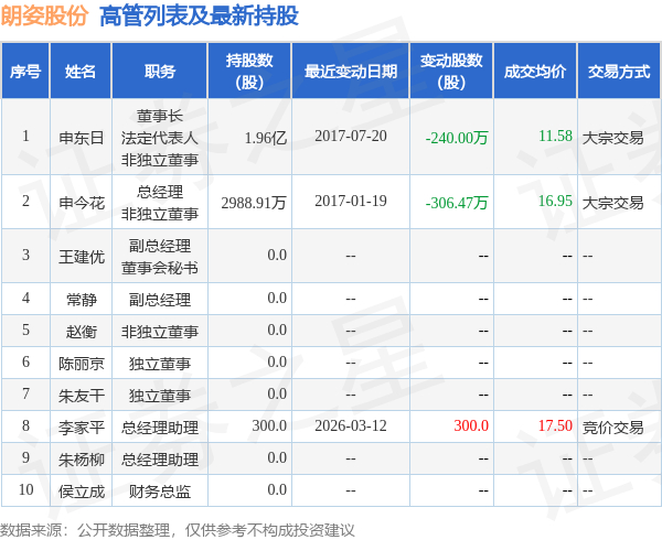 朗姿股份的高管列表及最新持股情况如下: