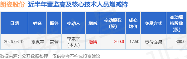 证券之星消息,根据3月13日市场公开信息、上市公司公告及交易所披露数据整理,朗姿股份(002612)最新董监高及相关人员股份变动情况:2026年3月12日公司高管李家平共增持公司股份300.0股,占公司总股本为0.0001%。变动期间公司股价下跌0.91%,3月12日当日收盘报17.47元。