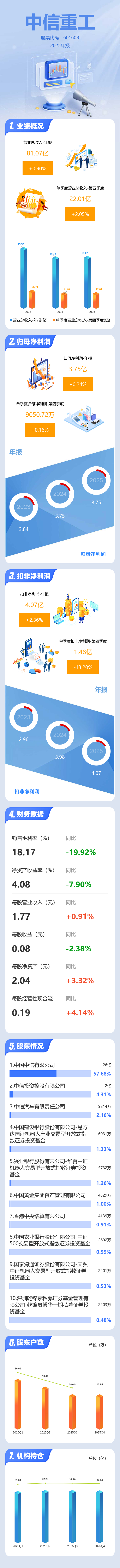 证券之星消息,中信重工2025年年报显示,当年度公司主营收入81.07亿元,同比上升0.91%;归母净利润3.75亿元,同比上升0.24%;扣非净利润4.07亿元,同比上升2.36%;其中2025年第四季度,公司单季度主营收入22.01亿元,同比上升2.05%;单季度归母净利润9050.72万元,同比上升0.17%;单季度扣非净利润1.48亿元,同比下降13.21%;负债率52.44%,投资收益3105.69万元,财务费用3266.11万元,毛利率18.17%。