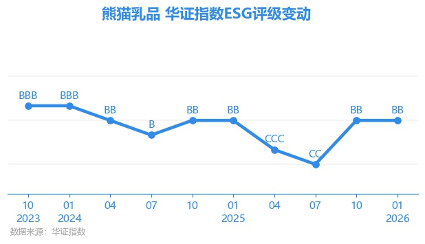 日前,华证指数公布了新一期(2026年1月31日)的ESG评级结果,熊猫乳品(300898.SZ)获得BB评级(华证指数评级为C起至AAA九档,C为最低档,AAA为其最高一级评级/AA为其第二档),上一期(2025年10月31日)ESG评级为BB。本期ESG评级在167家食品行业A股上市公司中排名第37(上一期排名第40)。