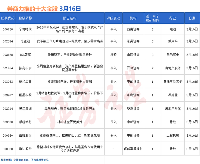 比亚迪也备受券商关注,近一个月获华金证券、开源证券等3份券商研报关注,位居3月16日券商力推股榜第二。
