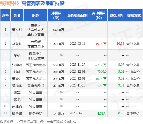 证券之星消息,根据3月16日市场公开信息、上市公司公告及交易所披露数据整理,银禧科技(300221)最新董监高及相关人员股份变动情况:2026年3月13日公司董事,高管林登灿共增持公司股份19.0万股,占公司总股本为0.0401%。变动期间公司股价下跌1.31%,3月13日当日收盘报10.51元。