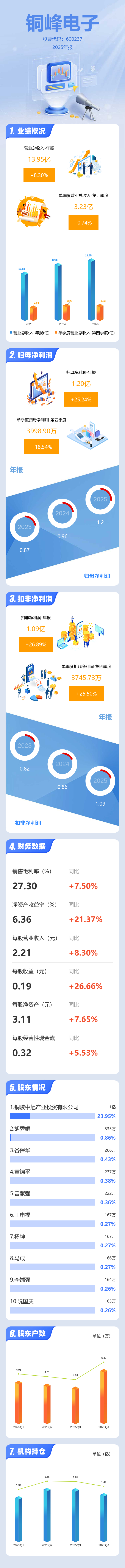 证券之星消息,铜峰电子2025年年报显示,当年度公司主营收入13.95亿元,同比上升8.31%;归母净利润1.2亿元,同比上升25.24%;扣非净利润1.09亿元,同比上升26.89%;其中2025年第四季度,公司单季度主营收入3.23亿元,同比下降0.74%;单季度归母净利润3998.9万元,同比上升18.55%;单季度扣非净利润3745.73万元,同比上升25.51%;负债率27.17%,投资收益599.84万元,财务费用-517.09万元,毛利率27.3%。