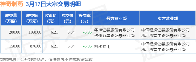 证券之星消息,3月17日神奇制药发生大宗交易,交易数据如下: