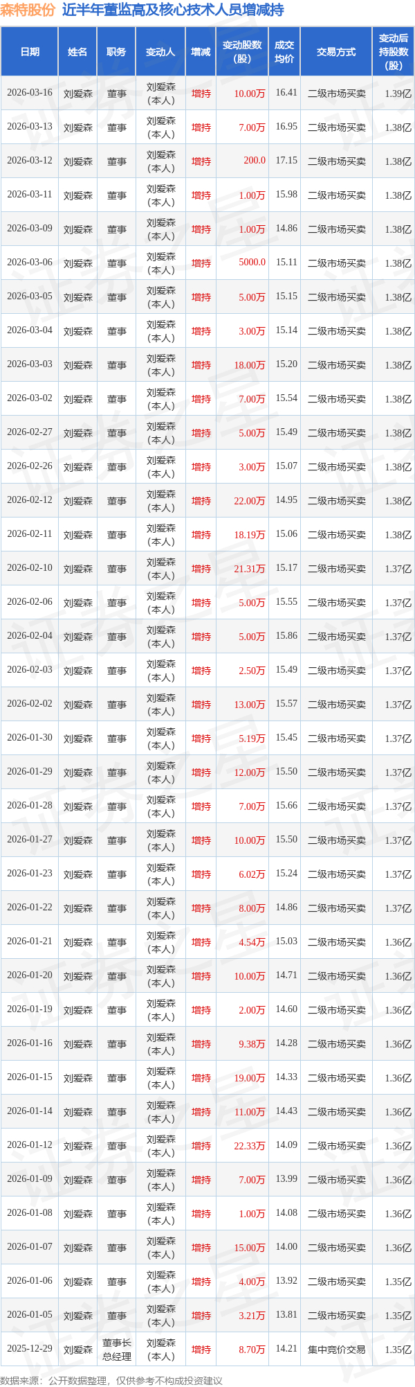 森特股份近半年内的董监高及核心技术人员增减持详情如下: