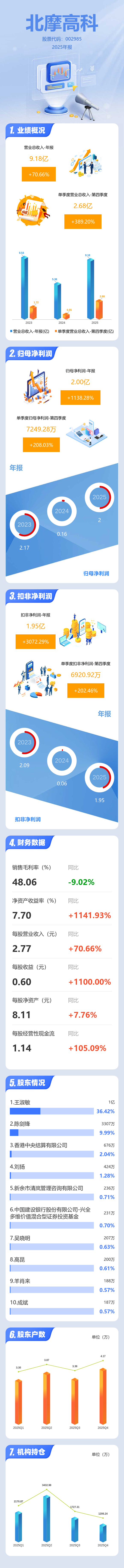 证券之星消息,北摩高科2025年年报显示,当年度公司主营收入9.18亿元,同比上升70.66%;归母净利润2.0亿元,同比上升1138.28%;扣非净利润1.95亿元,同比上升3072.3%;其中2025年第四季度,公司单季度主营收入2.68亿元,同比上升389.21%;单季度归母净利润7249.28万元,同比上升208.04%;单季度扣非净利润6920.92万元,同比上升202.47%;负债率28.32%,投资收益267.99万元,财务费用569.73万元,毛利率48.06%。