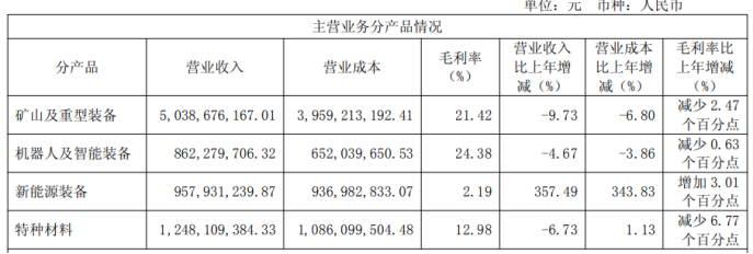 三大新兴业务板块整体表现不及预期,未能有效填补主业失速带来的缺口。其中,机器人及智能装备、特种材料实现营收8.62亿元、12.48亿元,同比分别下滑4.67%、6.73%。二者毛利率分别为24.38%、12.98%,同比分别减少0.63、6.77个百分点。