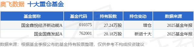 根据2025基金年报公募基金重仓股数据,重仓该股的公募基金共2家,其中持有数量最多的公募基金为国金基金的国金鑫悦经济新动能A。国金鑫悦经济新动能A目前规模为0.32亿元,最新净值1.1222(3月17日),较上一交易日下跌2.82%,近一年上涨28.3%。该公募基金现任基金经理为王小刚。王小刚在任的基金产品包括:国金国鑫发起A,管理时间为2022年12月28日至今,期间收益率为16.64%;