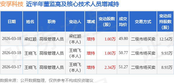 证券之星消息,根据3月19日市场公开信息、上市公司公告及交易所披露数据整理,安孚科技(603031)最新董监高及相关人员股份变动情况:2026年3月18日公司高级管理人员梁红颖、高级管理人员王晓飞共增持公司股份2.0万股,占公司总股本为0.0078%。变动期间公司股价下跌2.58%,3月18日当日收盘报49.9元。