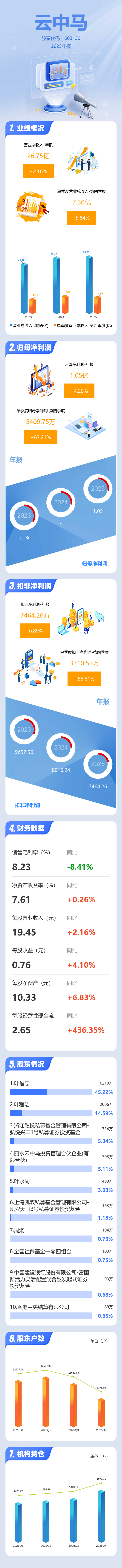 证券之星消息,云中马2025年年报显示,当年度公司主营收入26.75亿元,同比上升2.16%;归母净利润1.05亿元,同比上升4.21%;扣非净利润7464.26万元,同比下降6.89%;其中2025年第四季度,公司单季度主营收入7.3亿元,同比下降5.84%;单季度归母净利润5409.75万元,同比上升63.21%;单季度扣非净利润3310.52万元,同比上升55.81%;负债率48.3%,投资收益376.14万元,财务费用845.83万元,毛利率8.23%。