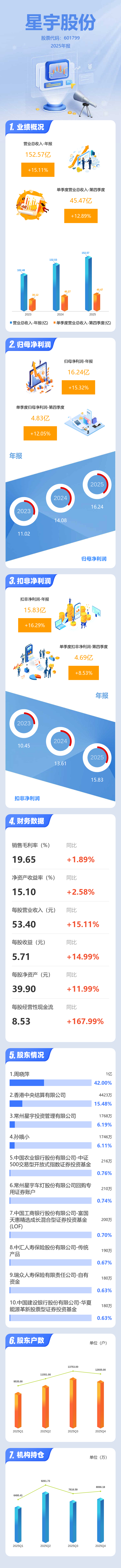 证券之星消息,星宇股份2025年年报显示,当年度公司主营收入152.57亿元,同比上升15.12%;归母净利润16.24亿元,同比上升15.32%;扣非净利润15.83亿元,同比上升16.29%;其中2025年第四季度,公司单季度主营收入45.47亿元,同比上升12.89%;单季度归母净利润4.83亿元,同比上升12.06%;单季度扣非净利润4.69亿元,同比上升8.53%;负债率41.08%,投资收益159.53万元,财务费用-523.63万元,毛利率19.65%。