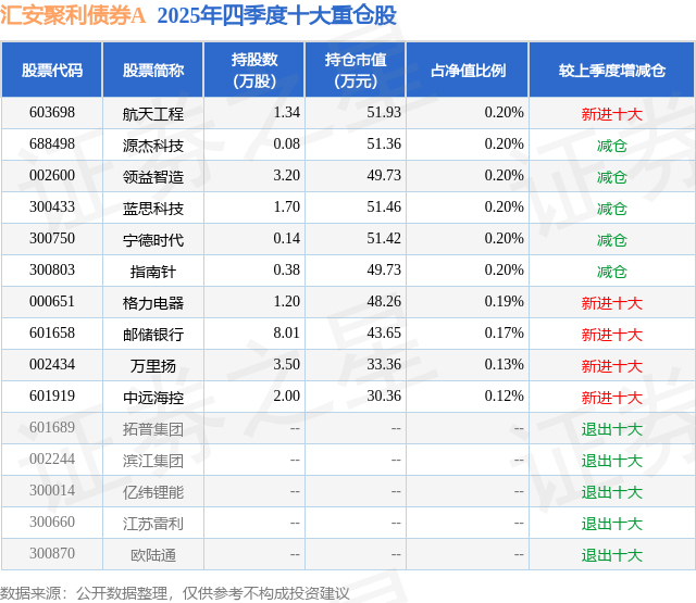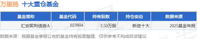 根据2025基金年报公募基金重仓股数据,重仓该股的公募基金共1家,其中持有数量最多的公募基金为汇安基金的汇安聚利债券A。汇安聚利债券A目前规模为1.13亿元,最新净值1.0092(3月19日),较上一交易日下跌0.57%。该公募基金现任基金经理为张昆 柳预才。张昆在任的基金产品包括:汇安恒利39个月定开纯债债券,管理时间为2020年12月23日至今,期间收益率为8.68%;汇安盛鑫三年定开纯债债券,管理时间为2021年1月12日至今,期间收益率为14.28%;汇安裕同纯债债券A,管理时间为2022年6月22日至今,期间收益率为12.41%;汇安信泰稳健一年持有期混合A,管理时间为2024年3月26日至今,期间收益率为6.17%。柳预才在任的基金产品包括:汇安宜创量化精选混合A,管理时间为2020年12月30日至今,期间收益率为37.87%;汇安中证500增强A,管理时间为2022年12月23日至今,期间收益率为45.48%;汇安多因子混合A,管理时间为2023年5月29日至今,期间收益率为53.06%;汇安多策略混合A,管理时间为2023年6月6日至今,期间收益率为72.87%。