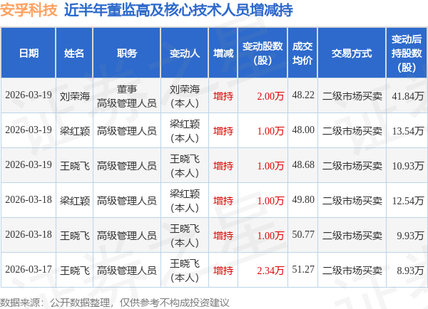证券之星消息,根据3月20日市场公开信息、上市公司公告及交易所披露数据整理,安孚科技(603031)最新董监高及相关人员股份变动情况:2026年3月19日公司高级管理人员梁红颖、高级管理人员王晓飞、董事,高级管理人员刘荣海共增持公司股份4.0万股,占公司总股本为0.0156%。变动期间公司股价下跌4.71%,3月19日当日收盘报47.55元。