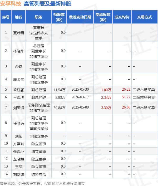 安孚科技近半年内的董监高及核心技术人员增减持详情如下: