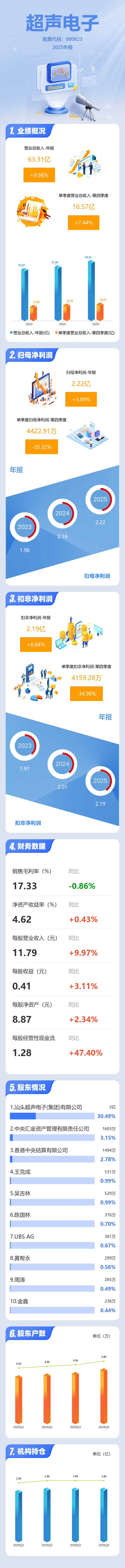 证券之星消息,超声电子2025年年报显示,当年度公司主营收入63.31亿元,同比上升9.98%;归母净利润2.22亿元,同比上升3.1%;扣非净利润2.19亿元,同比上升8.65%;其中2025年第四季度,公司单季度主营收入16.57亿元,同比上升7.45%;单季度归母净利润4422.91万元,同比下降35.33%;单季度扣非净利润4159.28万元,同比下降34.98%;负债率36.24%,投资收益1415.11万元,财务费用3480.21万元,毛利率17.33%。
