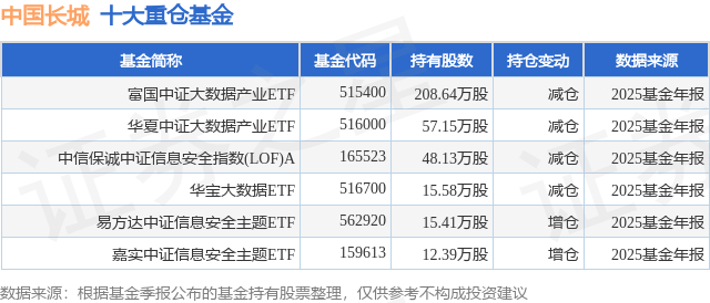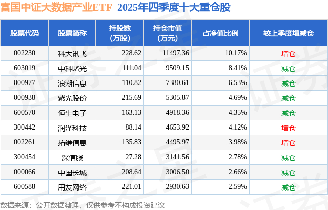根据2025基金年报公募基金重仓股数据,重仓该股的公募基金共6家,其中持有数量最多的公募基金为富国基金的富国中证大数据产业ETF。富国中证大数据产业ETF目前规模为11.31亿元,最新净值0.9766(3月20日),较上一交易日下跌3.89%,近一年下跌0.64%。该公募基金现任基金经理为蔡卡尔。蔡卡尔在任的基金产品包括:富国中证医药主题指数增强A,管理时间为2017年1月6日至今,期间收益率为46.36%;富国港股通量化精选股票A,管理时间为2018年5月30日至今,期间收益率为29.12%;富国沪深300ESG基准ETF,管理时间为2021年6月24日至今,期间收益率为0.17%。