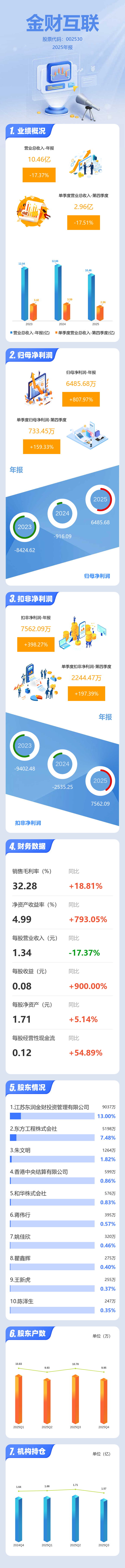 证券之星消息,金财互联2025年年报显示,当年度公司主营收入10.46亿元,同比下降17.38%;归母净利润6485.68万元,同比上升807.97%;扣非净利润7562.09万元,同比上升398.28%;其中2025年第四季度,公司单季度主营收入2.96亿元,同比下降17.51%;单季度归母净利润733.45万元,同比上升159.34%;单季度扣非净利润2244.47万元,同比上升197.4%;负债率32.68%,投资收益1485.8万元,财务费用296.84万元,毛利率32.28%。