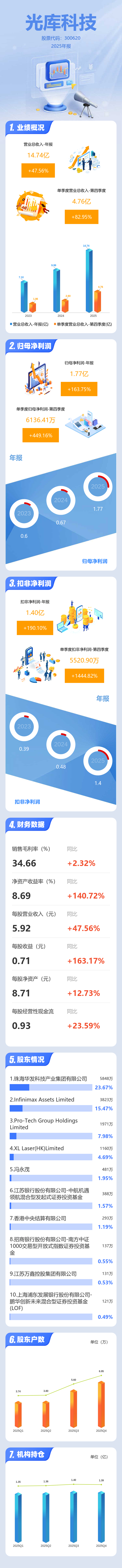 证券之星消息,光库科技2025年年报显示,当年度公司主营收入14.74亿元,同比上升47.56%;归母净利润1.77亿元,同比上升163.76%;扣非净利润1.4亿元,同比上升190.11%;其中2025年第四季度,公司单季度主营收入4.76亿元,同比上升82.96%;单季度归母净利润6136.41万元,同比上升449.16%;单季度扣非净利润5520.9万元,同比上升1444.83%;负债率40.37%,投资收益212.35万元,财务费用660.88万元,毛利率34.66%。