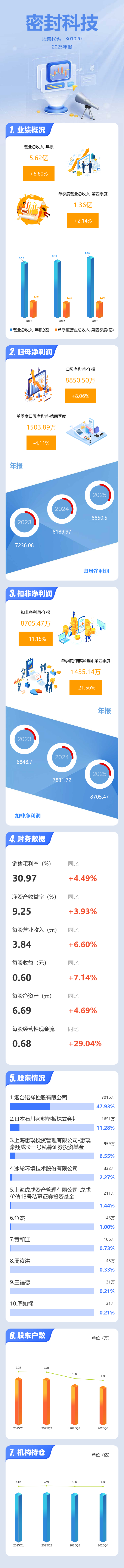 证券之星消息,密封科技2025年年报显示,当年度公司主营收入5.62亿元,同比上升6.6%;归母净利润8850.5万元,同比上升8.07%;扣非净利润8705.47万元,同比上升11.16%;其中2025年第四季度,公司单季度主营收入1.36亿元,同比上升2.14%;单季度归母净利润1503.89万元,同比下降4.11%;单季度扣非净利润1435.14万元,同比下降21.57%;负债率21.85%,投资收益124.58万元,财务费用-1264.41万元,毛利率30.97%。