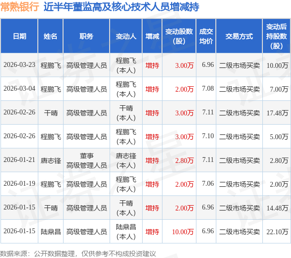 证券之星消息,根据3月24日市场公开信息、上市公司公告及交易所披露数据整理,常熟银行(601128)最新董监高及相关人员股份变动情况:2026年3月23日公司高级管理人员程鹏飞共增持公司股份3.0万股,占公司总股本为0.0009%。变动期间公司股价下跌2.26%,3月23日当日收盘报6.92元。