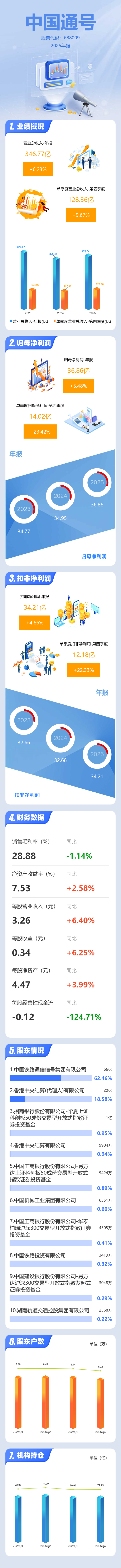 证券之星消息,中国通号2025年年报显示,当年度公司主营收入346.77亿元,同比上升6.23%;归母净利润36.86亿元,同比上升5.49%;扣非净利润34.21亿元,同比上升4.66%;其中2025年第四季度,公司单季度主营收入128.36亿元,同比上升9.67%;单季度归母净利润14.02亿元,同比上升23.43%;单季度扣非净利润12.18亿元,同比上升22.34%;负债率55.65%,投资收益1.2亿元,财务费用-5599.21万元,毛利率28.88%。